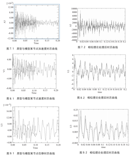 从图中可以看出,表3给出的缩尺比能够简单有效的通过模型试验预测板架结构遭受水下爆炸时的振动响应特性,应用本文提出的相似方法处理后的原型与模型时历曲线吻合的很好。最大误差不超过20%。本文应用 abaqus软件分析水下爆炸冲击波响应时,板架结构的冲击响应符合实际爆炸的冲击响应规律,可以认为利用该软件进行工程计算具有一定的可信度。