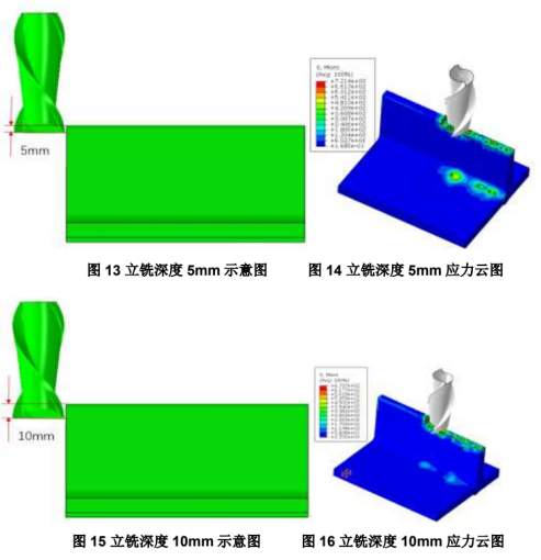 3.立铣的加工深度对立筋根部的应力有较大影响。由于深度即影响了立筋的刚度,又由于切削量的不同影响了切削力的大小,所以切削深度和立筋根部的应力值不是简单的线性关系,实际加工过程中如果确有必要采取此种加工工艺,需要合理定义切削深度;