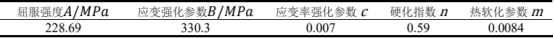 式中,a 为准静态条件下的屈服强度;p为等效塑性应变;0为材料的参考应变率;p为等效塑性应变率;b 为材料应变强度参数;n 为硬化指数;c 为应变率强化参数;t0为常温系数,通常取 25℃;tmelt为材料熔点;m 为热软化参数。工件材料的 johnson-cook 本构模型参数设置见表 1。