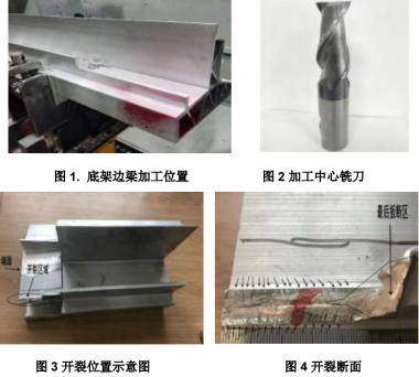 铝合金地铁底架为铝合金型材结构,通过机加工的方式去除指定区域,完成底架边梁部件的生产制造。图1显示的为其中一个底架边梁的加工场景。在该场景中,使用图2中的铣刀,依据文件要求铣削底架边梁的立筋,完成底架边梁的加工。某项目采用了新的型材断面,和组装结构,因此机加工流程也相应更新。在使用的新的工艺后,发现在边梁根部出现了可见裂纹。如图3和图4所示。