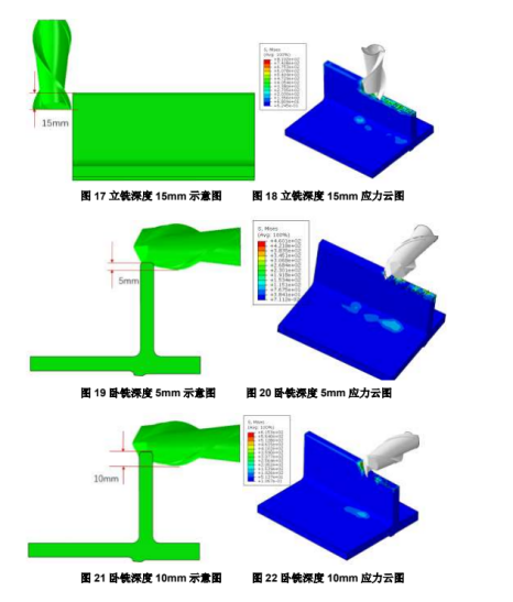 3.对立铣的应力分析,可以看到深度与应力值并不存在绝对的线性相关。应力最大值时候的深度最浅(为5mm),但应力最小值时候不是深度最深(15mm),而是10mm的深度时应力值最小。