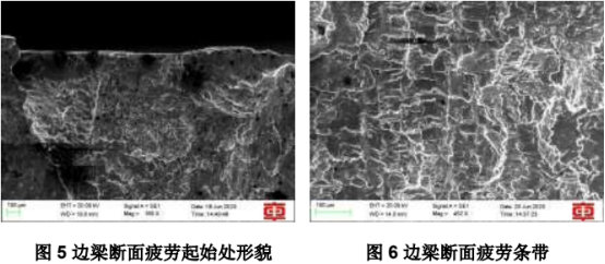 对裂纹进行电镜扫描,可见明显的疲劳断裂裂纹拓展形貌,如图 5 图 6 所示。说明裂纹主要由于往复载荷引起的疲劳所致。为了进一步研究裂纹的产生原因和不同工艺的影响,采用基于显式动力学的有限元分析方法对加工过程进行模拟方程,获得部件的应力分布和应力曲线,进而为优化工艺,保证产品质量提供重要依据。