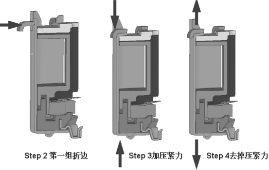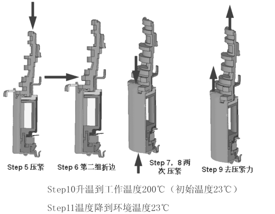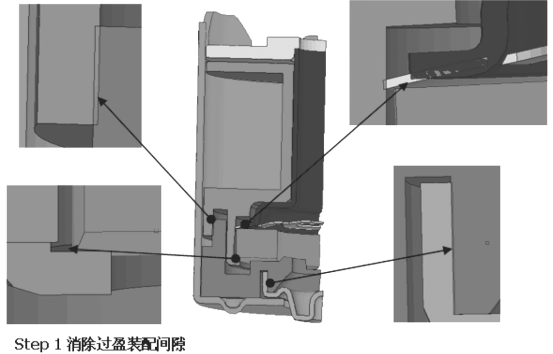 本模型需要分析两组折边封装,第一组折边内的零件处于安装完成后的位置,第一个分析步是模拟第一组折边内部零件的过盈配合,建立内部零件间的接触关系。具体分析步骤见图1~图 3。