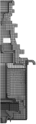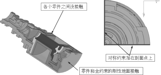 为了减小模型尺寸,使用1/4对称模型。采用cd8i和 c3d6固体单元划分网格,关键零件厚度方向采用4层单元。模型包含14533个单元,21023个节点。材料均使用非线性材料,模型和边界条件分别如图4和图5 所示: