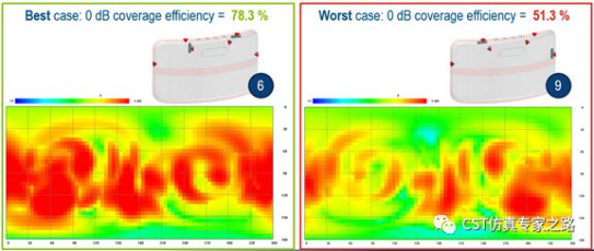 对比最优和最差的设计与仿真结果。从设计上看,两种安装方式有其相似性,但所得的覆盖效率却差距很大。因此,在设计过程中通过仿真分析即可方便的确定最优的天线安装位置。