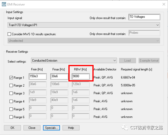 接下来可以用emi receiver对电压信号进行后处理,得到频域结果。为了更好地和测试结果进行对比,可以参考测试emi接收机的设置,调整rbw的值。