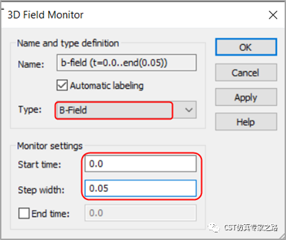 19.在type一栏选择b-field,start time设置为0, step width设置为0.05,然后点击apply按钮,磁感应强度监视器设置完成。按照同样的方式,在type的下拉菜单中选择磁场h-field、电场e-field和cond. current dens.,设置磁场/电场/电流监视器。