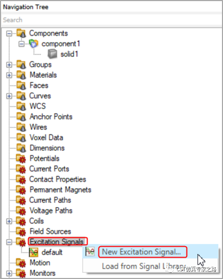 16.创建一个交流激励信号,在导航树中选中excitation signals,然后右键选择new excitation signal,弹出激励信号对话框。